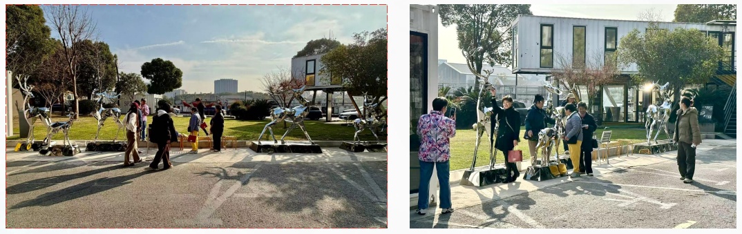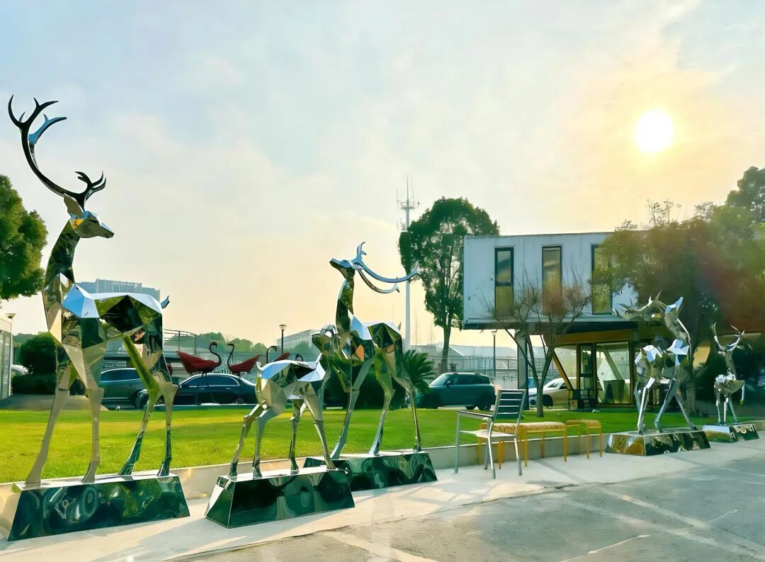 雕塑群的场景化布局也充满巧思:5只鹿分散于园区不同区域,一侧以“家族组合”(2只成年鹿+1只幼鹿)营造温馨氛围,成为街道视觉焦点;另一侧两只成年鹿姿态灵动、自由,象征创意探索与科创精神的无界生长。