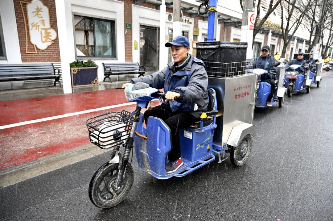 10点10分,彭浦新村街道第一综合为老服务中心社区食堂门口,5辆助老送餐车在漫天的雪花中出发。
