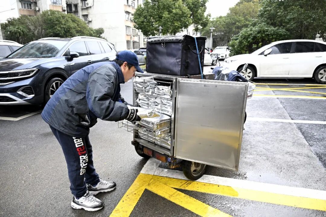 送餐员孙中法师傅准时出现在保德路921弄居民区。因为87岁独居老人王阿婆听力衰退,且腿脚不方便,孙师傅每次都是一边用力敲响老人家的铁门,一边大声招呼。“小孙师傅你来啦,还以为下雪会晚些送到,没想到不仅准时,饭菜好像格外热乎。”