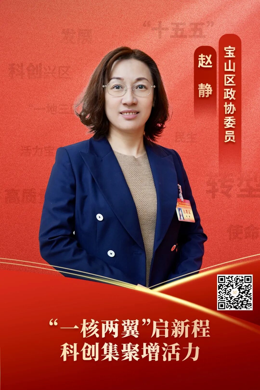 1月19日—1月23日,宝山区九届人大八次会议和宝山区政协九届六次会议在区委党校隆重举行。两会期间,代表委员将认真聆听区政府工作报告,积极建言献策、凝聚智慧力量。 宝山融媒同步推出《融媒会客厅——代表委员话两会》节目,邀请部分代表委员就如何履职尽责,助力宝山“北转型”谈感想、说看法、提建议。 宝山区政协委员 赵静