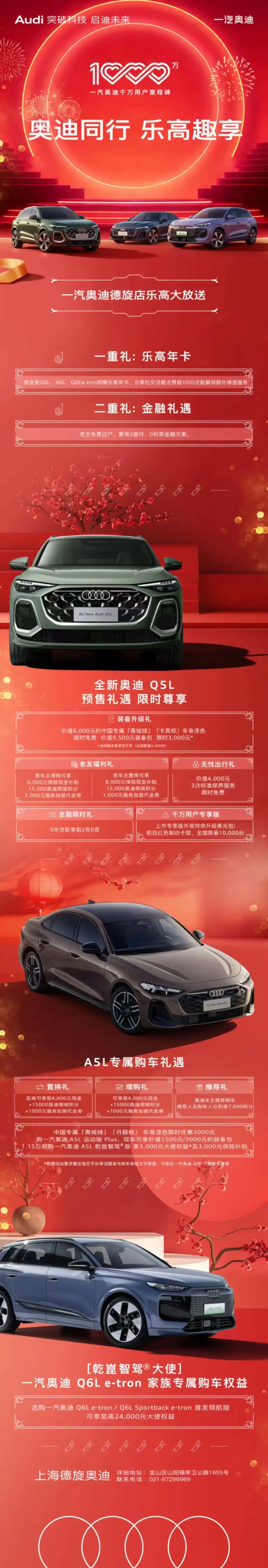 即日起至2026年3月31日,购买全新Q5L、A5L、Q6E e-tron等指定车型,即赠上海乐高乐园度假区银卡1张(共15张,先到先得)。分享社交话题点赞超1000还能解锁额外增值服务,老车主免费过户,更有0首付、0利率金融方案!