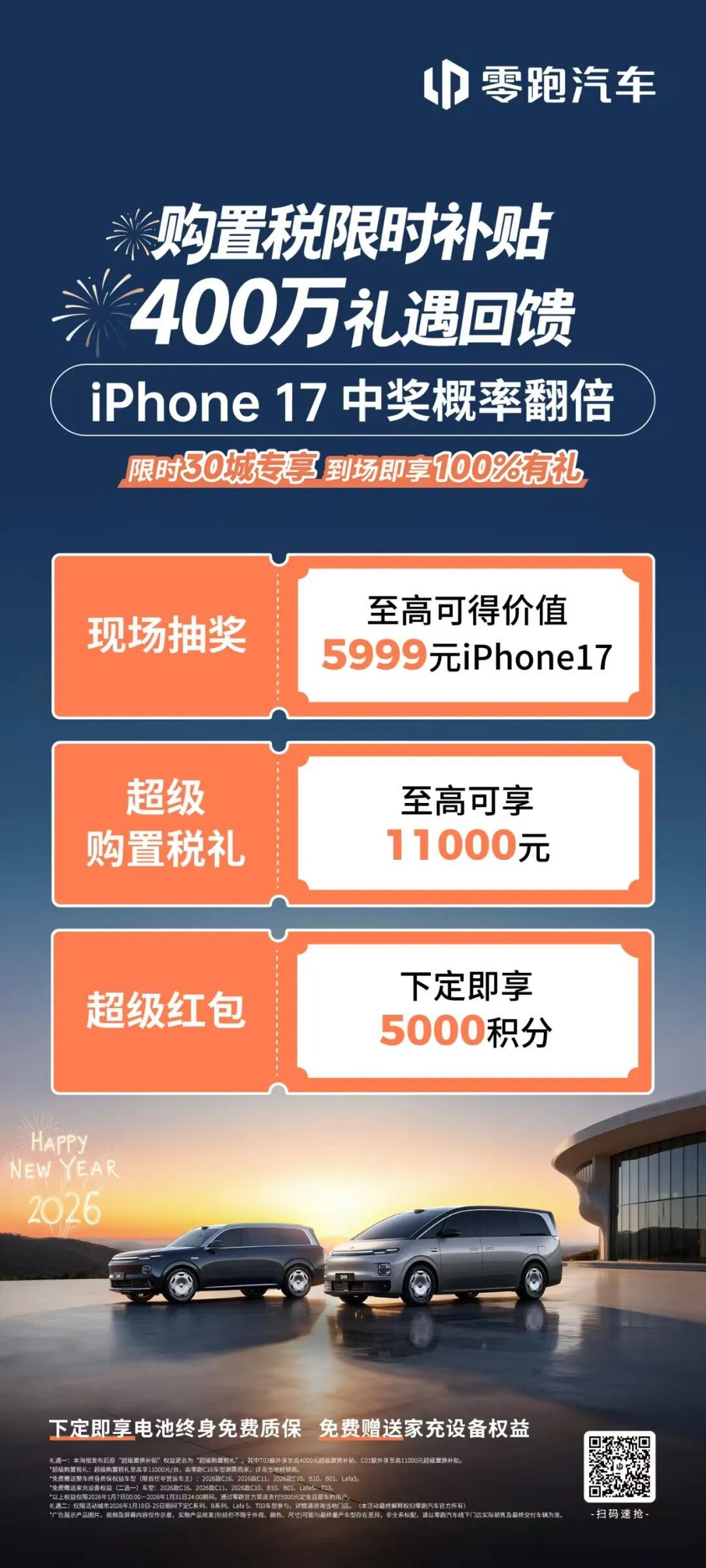 即日起至2月28日购买指定车型(C11、Lafa5),赠送上海乐高乐园度假区银卡1张(共15张,先到先得)。同时,还有iPhone 17抽奖概率翻倍活动,更享电池终身质保与免费家充设备!