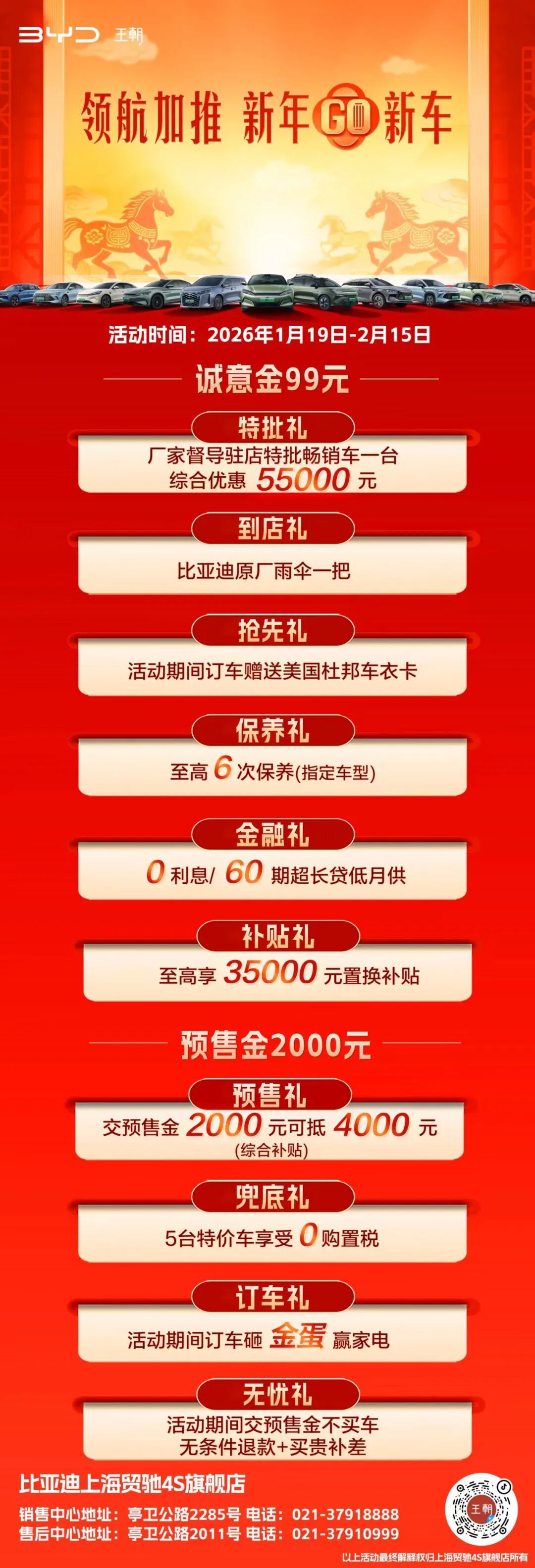 2026年1月19日至2月15日,在门店购买指定车型(秦PLUS,宋PRODMI),即赠上海乐高乐园度假区银卡1张(共15张,先到先得)。99元诚意金即可锁定特批车综合优惠55000元,到店就送原厂雨伞,订车赠杜邦车衣卡,还有至高6次保养、0利息超长贷、35000元置换补贴等多重福利!