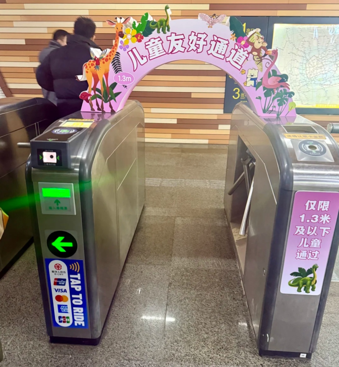 儿童通道有明显的标识,限身高1.3m以下的儿童通过,闸机常开。有家长欣喜表示,再也不用急急忙忙冲过闸机,担心被夹了。