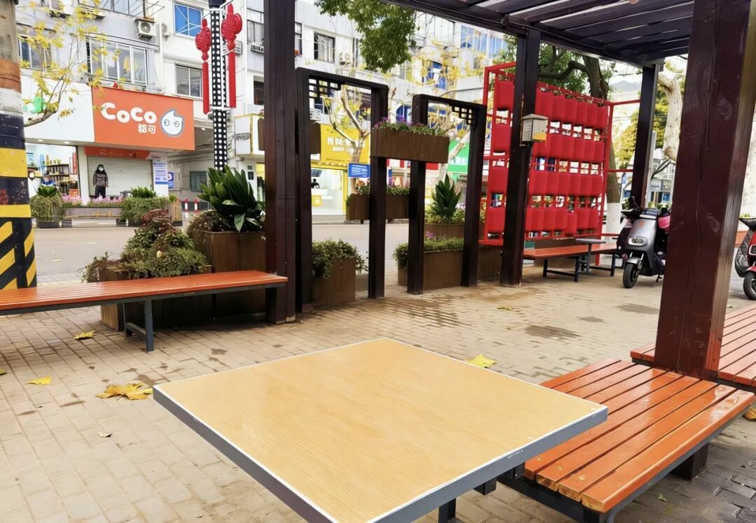 八一路文化长廊是城桥镇老街居民休闲社交的重要场所,陪伴街坊邻里多年的凳椅早已老化斑驳,破损的顶棚、摇晃的立柱更是藏着安全隐患。此次翻新升级不仅修复了破损顶棚与立柱,还新增了适配居民需求的棋桌与凳椅,彻底解决了居民下棋、休憩的不便。