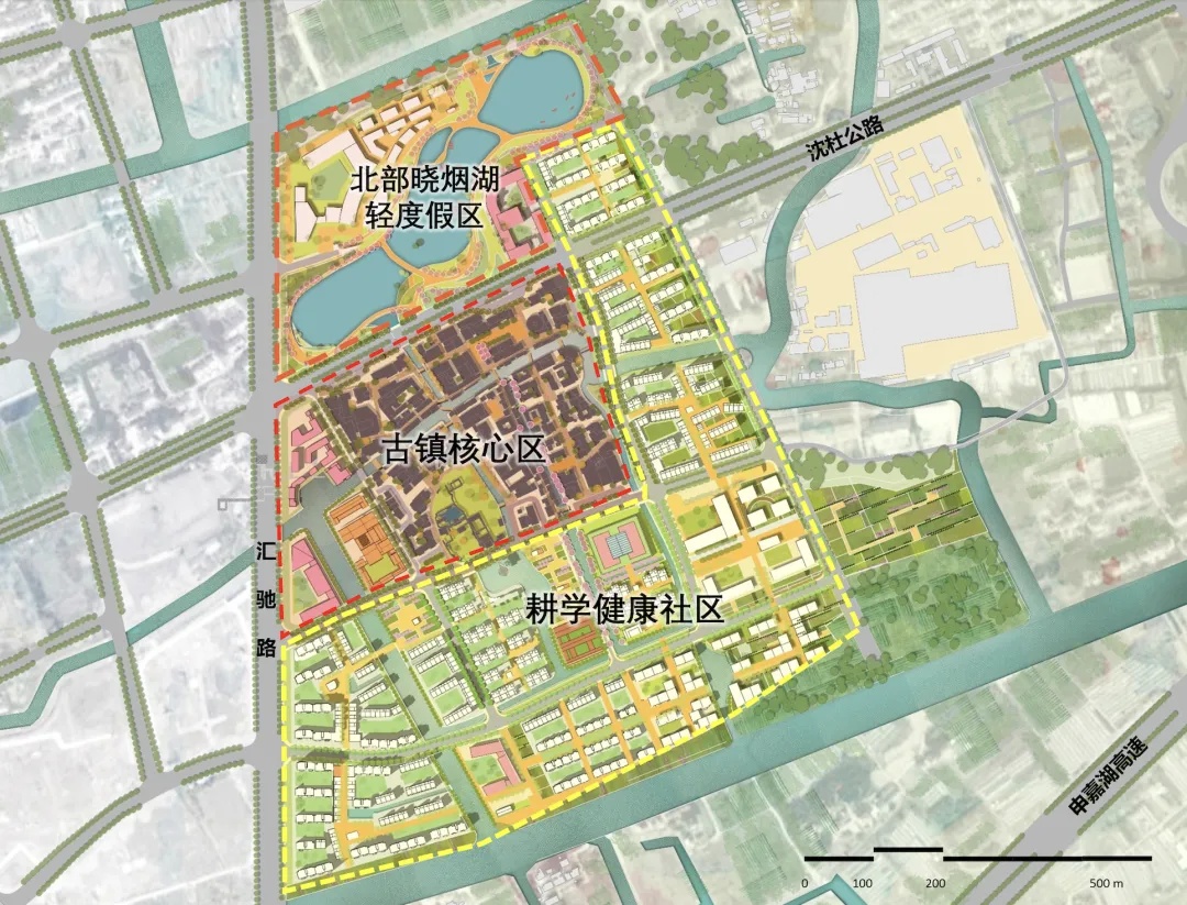 其中,中部召楼古镇片区作为古镇的核心区,将复兴和活化耕学文化,是召稼楼文化核心载体。北部晓烟湖轻度假区、南部耕读田园片区作为古镇的拓展区,将体现新的耕学文化和农耕体验方式,是召稼楼成为轻度假目的地的必要功能补充。