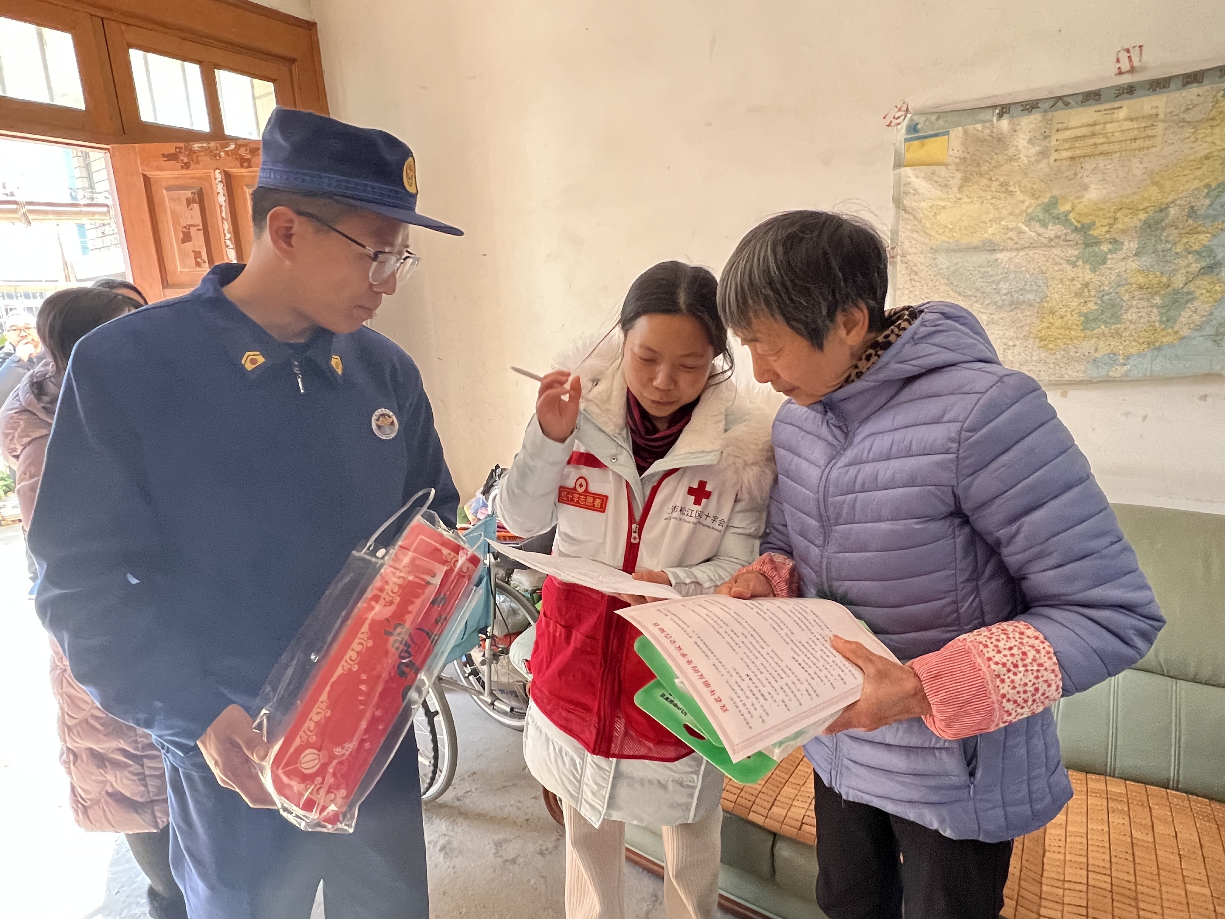 胡取珍是松江区红十字“救”在身边·冬日安全行动的受助老人之一。这项由松江区红十字会联合区消防救援局发起的专项行动,通过深入走访社区、农村家庭,为全区300余户社区重度困难失智(失能)老人开展入户慰问、安全科普与隐患排查。行动采用“专群结合、联合入户”的形式,由志愿者两人一组组成小队,携手消防指战员,逐户面对面讲解防火、用电安全知识,开展家庭安全隐患排查,并对护理用品使用情况进行回访,为特殊老年群体筑牢冬日安全防护网。