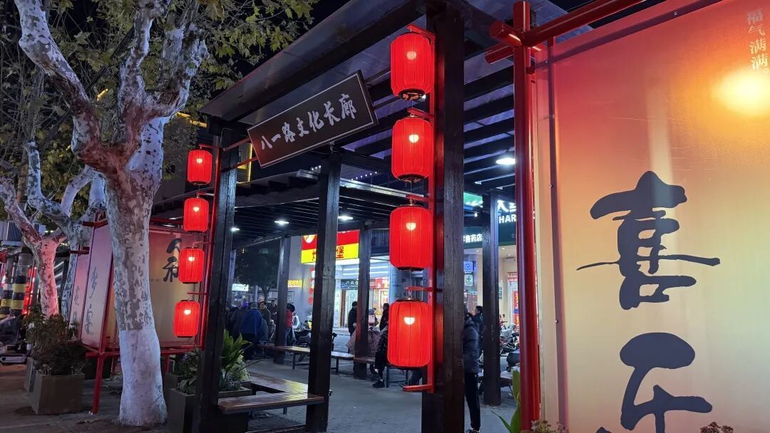 八一路文化长廊更显温情,红灯笼与中国结装点其间,廊下焕新的年花旁市民们愉快地闲谈,装点一新的文化长廊成为邻里相聚的新空间。