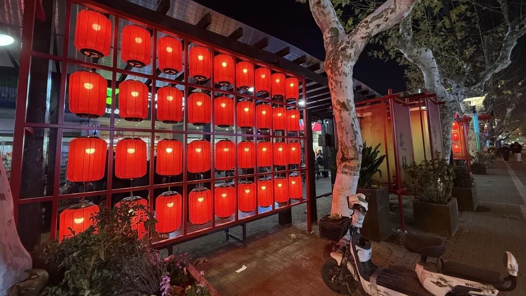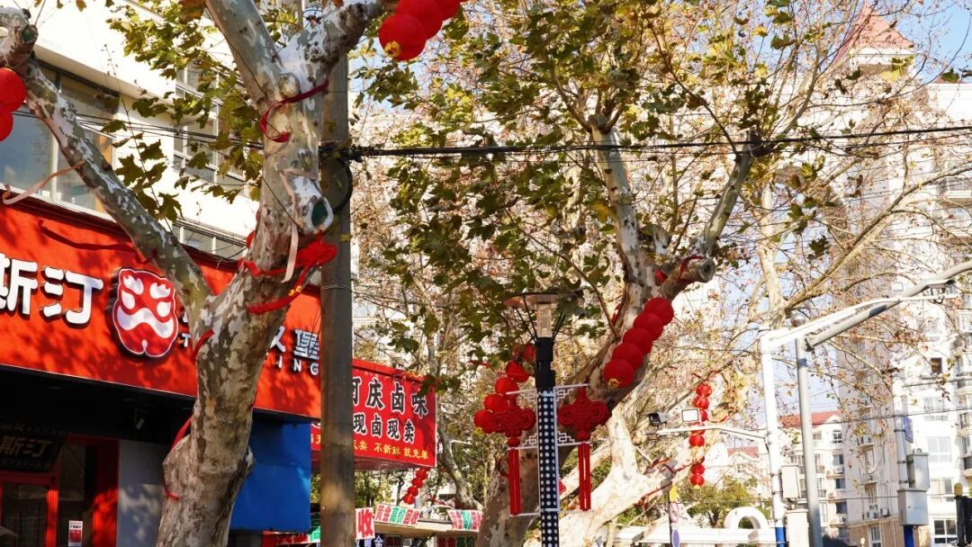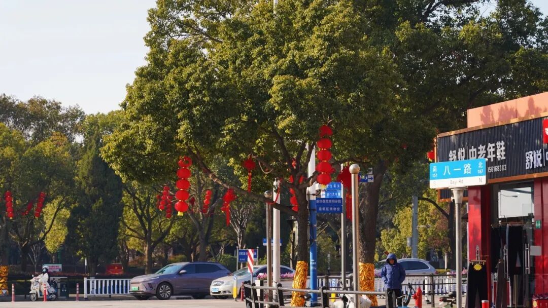 贯穿八一路的路灯上一盏盏朱红中国结搭配着行道树金色的新装,白日与沿线景致构成年味画卷,夜晚与灯光交织,照亮归人脚步。