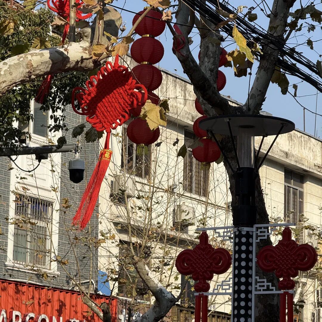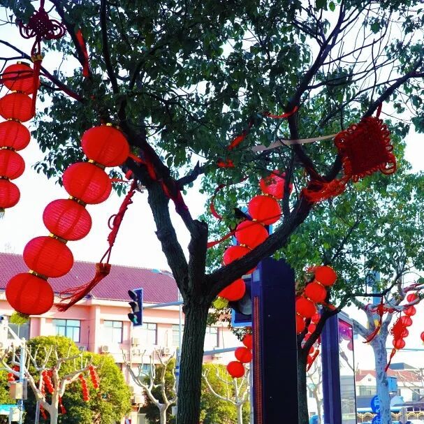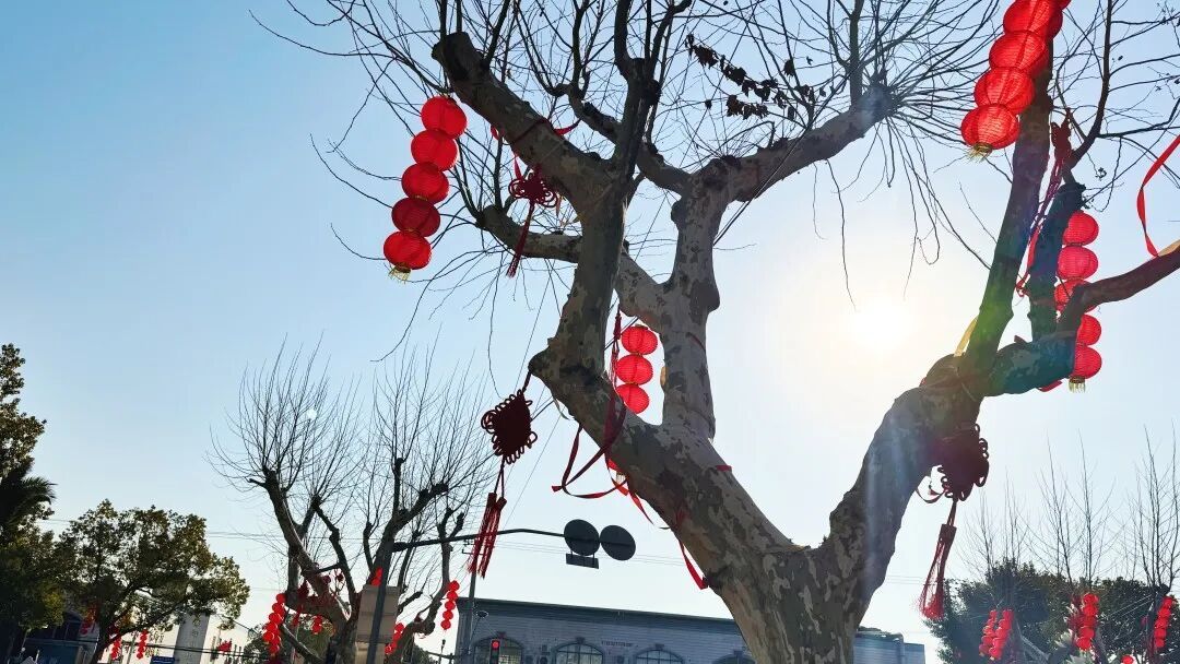 踏入核心年味地带——八一路,北门路、人民路、南门路三个十字路口集体“换装”。码头附近的枝头上,红色中国结与红绸呼应,景观灯柱上双排的中国结,提前预热新春氛围,仿佛热情地向在外工作的崇明人呼唤:在外拼搏的崇明人,快回来过年吧。
