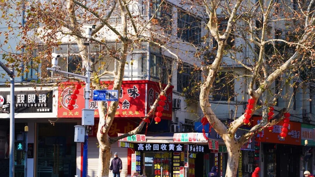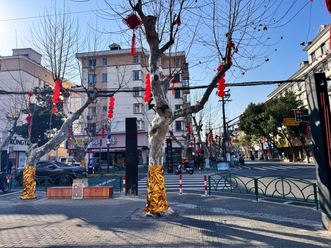 东门路与人民路十字路口也藏着惊喜,红绸点缀的路灯与街角绿植相映,简约装饰却透着十足年味。
