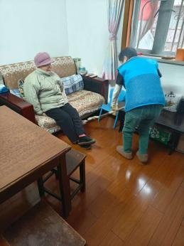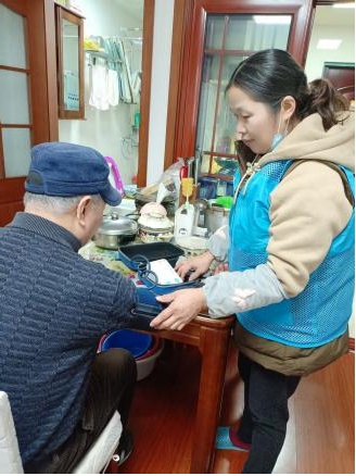 居家服务员赵阿姨如约来到广延路居民区李叔叔家中,一边为他测量血压,一边细心嘱咐:“爷叔,天冷血管容易收缩,药一定按时吃,快吃完就告诉我,我帮您配。”