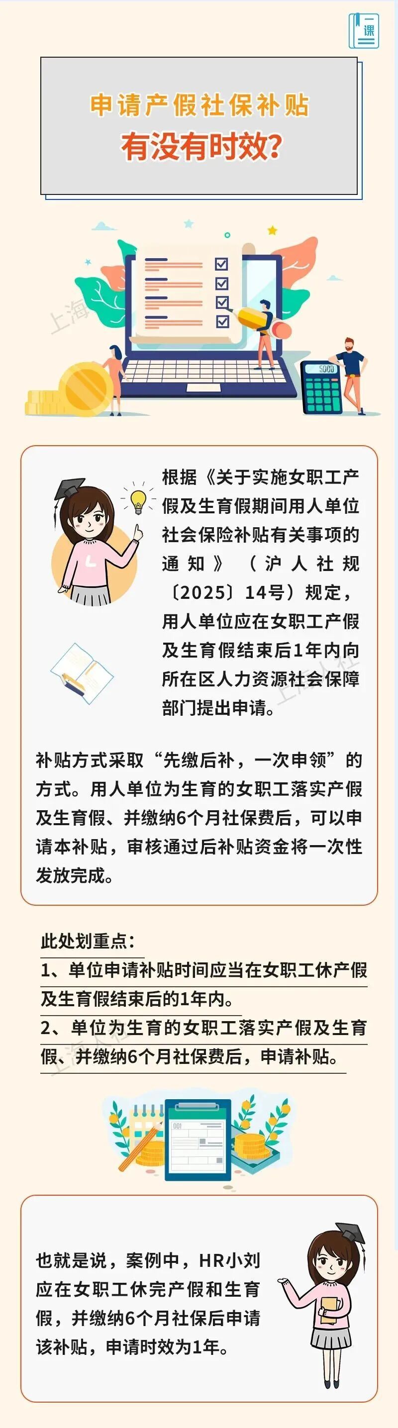 在初步了解了上海产假社保补贴后,HR小刘梳理了一下目前公司女职工休产假的情况。除了这一名女职工预计今年3月开始休产假,还有一位女职工初步在8月开始休产假,要明年才能来上班。那么届时是否可以一起申请补贴?申请这个补贴有时效吗?