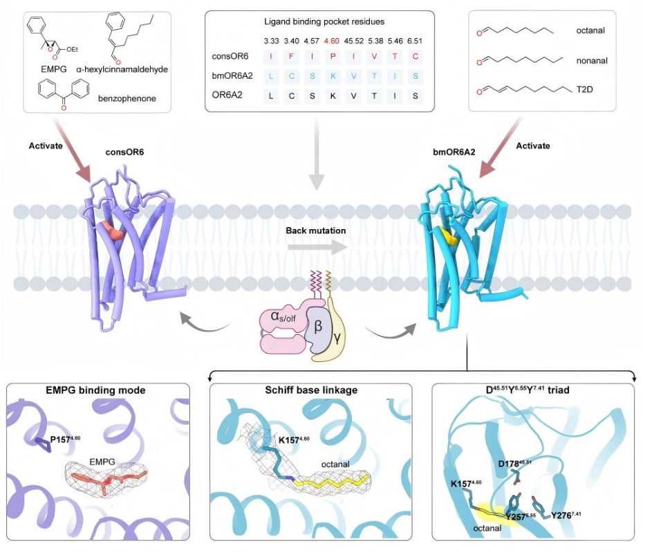 具体而言,研究团队首先解析了OR6亚家族的共识序列consOR6结构,并系统分析了配体结合口袋。随后,他们通过理性设计,构建出兼具结构稳定性与野生型配体识别能力的OR6A2变体bmOR6A2。进一步地,研究团队解析了bmOR6A2分别与3种天然醛类配体以及嗅觉特异性G蛋白Golf形成的复合物结构,最高分辨率达2.5埃。据此,团队实现了对嗅觉受体-配体-G蛋白相互作用的原子级刻画。