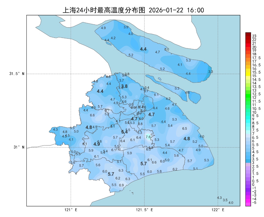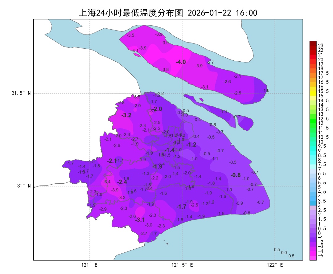 今天早晨全市最低气温都在冰点以下,崇明站-4.0℃全市最低。白天晴到多云,阳光虽然在线,但并不暖和,全市最高气温多在4、5℃上下,其中市区徐家汇站4.7℃。