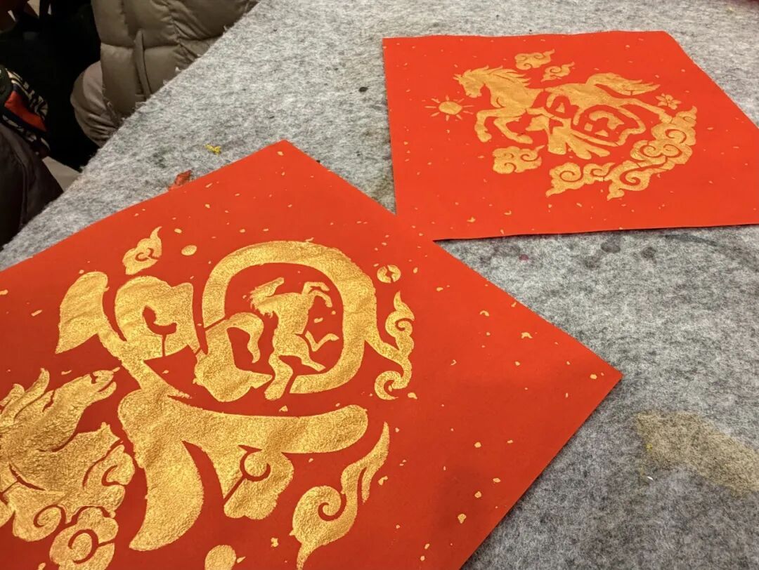 参与活动的张阿姨笑着展示自己的作品:“以前只在春联上见过‘福’字,今天亲手拓印,才知道这非遗手艺里藏着这么多讲究。这张‘马上有福’我要贴在大门上,讨个马年的好彩头。”一旁的小朋友也踮着脚,小心翼翼地为自己的作品添上最后一抹金墨,稚嫩的脸上满是成就感。
