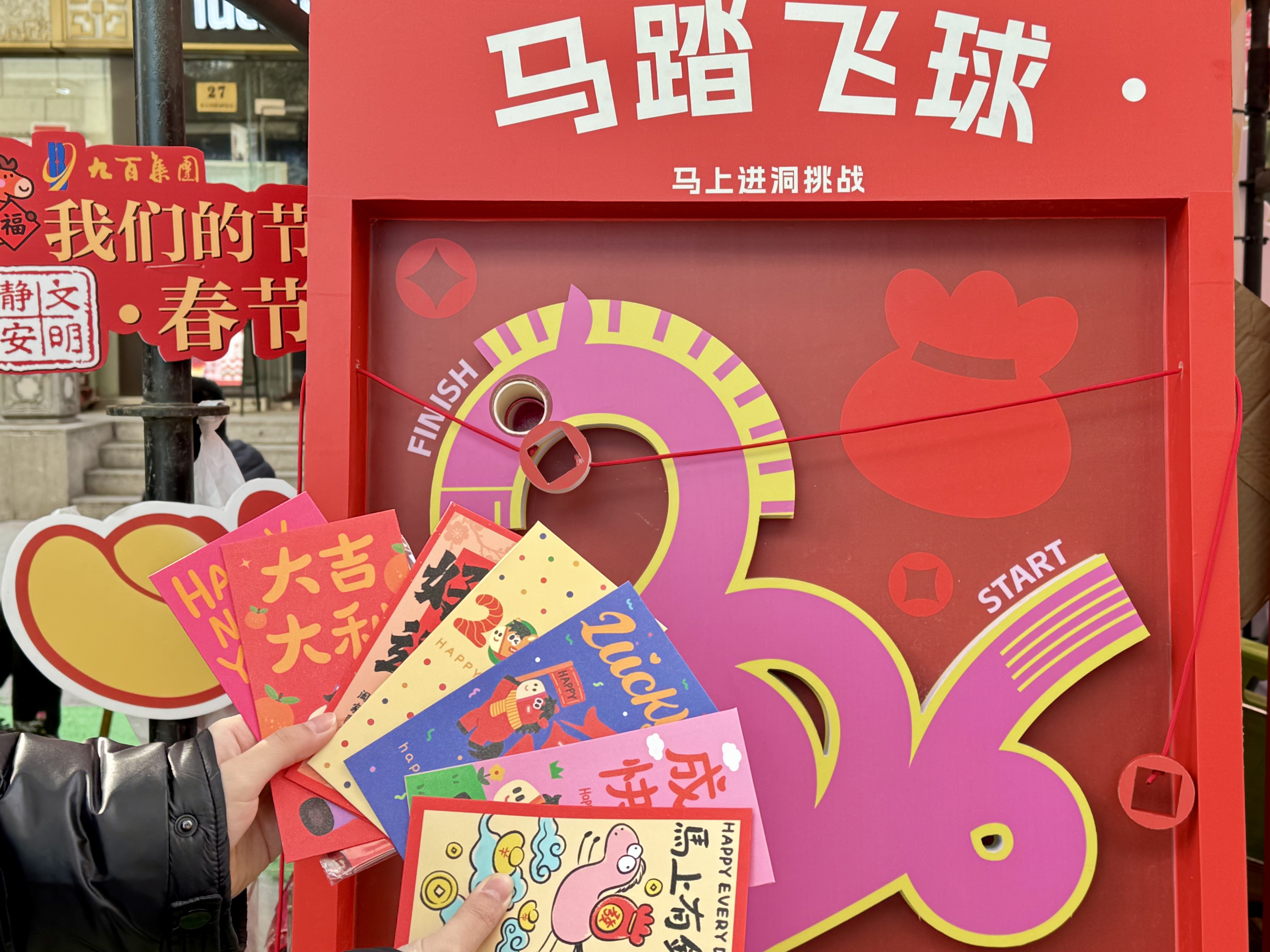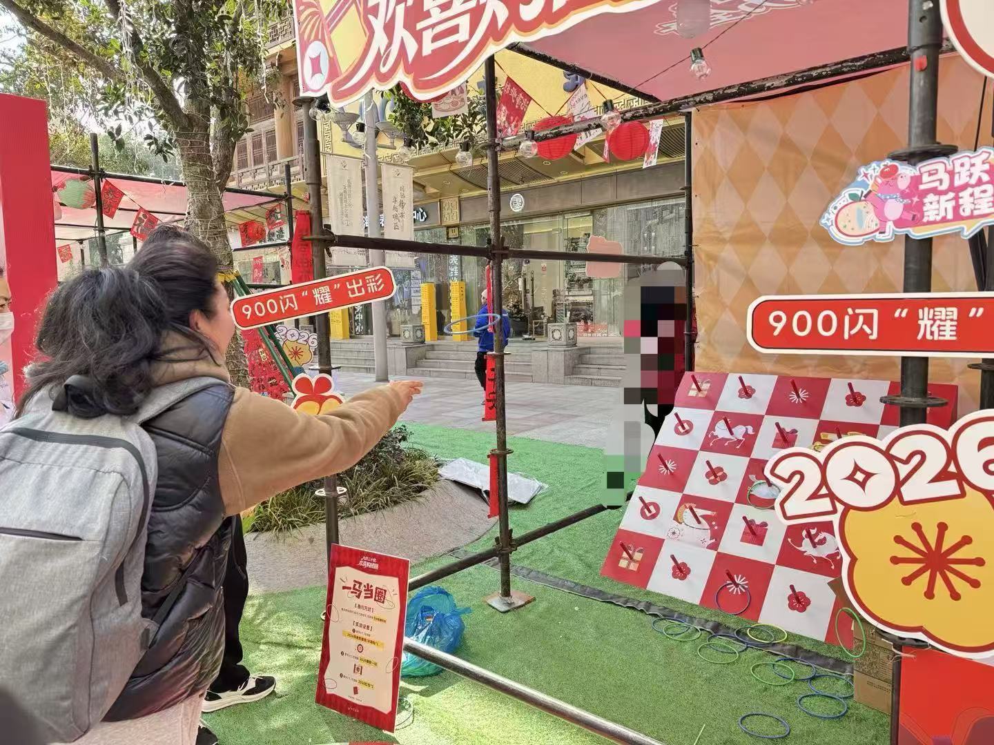 拿着游戏币,市民们纷纷涌向“马年抽签筒”“套马杆纳财”“幸运投币滚滚乐”等游戏区。一位市民捧着定制春联和红包笑着说:“挺有意思的,春节氛围感满满,好吃好买好逛,有种小时候过年赶庙会的感觉,大人小朋友都能玩得开心。”