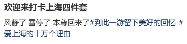 1月21日,刘翔发布动态,晒出在陆家嘴拍的照片,配文:风静了,雪停了,本尊回来了!欢迎来打卡上海四件套。