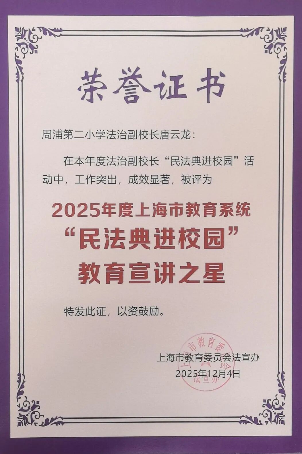 学校向监狱赠送“法育未来担使命 情系幼苗护成长”锦旗,并为唐云龙副监狱长颁发由市教委法宣办授予的“2025年度上海市教育系统民法典进校园教育宣讲之星”荣誉证书。