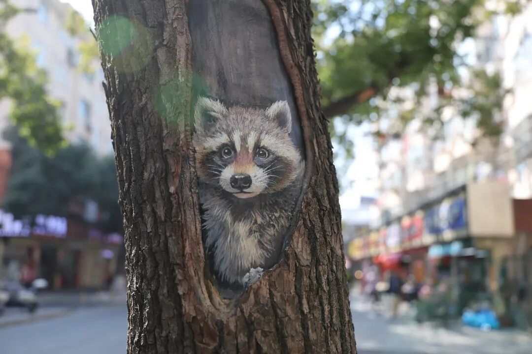 画笔下,树洞变成了一个个奇妙的世界:温顺的小兔子、机灵的小花猫、憨态的小浣熊……这些可爱的动物涂鸦,不仅装饰了树木的“伤疤”,也治愈了路人的疲惫。画师表示,这些作品旨在提倡“热爱生命、亲近自然”,让人们在日常生活中慢下来,发现身边的美好。