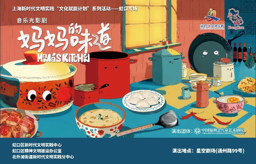 烟火人间,最念是妈妈的味道 新春将至 一场能看、能听、能“闻”的沉浸式好戏 就要来虹口北外滩啦! 1月28日,由虹口区新时代文明实践中心、区文明办、北外滩街道新时代文明实践分中心共同主办的上海新时代文明实践“文化赋能计划”系列活动——虹口专场又将和大家见面啦! 在全新启用的北外滩街道新时代文明实践分中心(通州路99号)1楼星空剧场,即将上演由中国福利会儿童艺术剧院倾力呈现的原创音乐光影剧《妈妈的味道》。