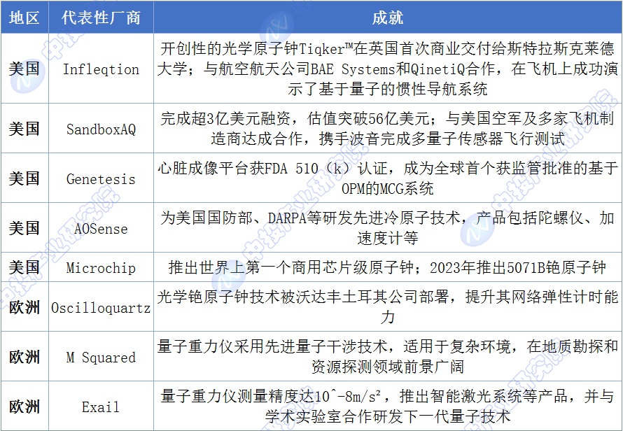 全球量子精密测量产业发展迅速,美国和欧洲在该领域处于领先地位,拥有一批具有代表性的厂商。美国厂商如Infleqtion、SandboxAQ、Genetesis、AOSense和Microchip等,欧洲厂商如Oscilloquartz、M Squared和Exail等,均在在量子精密测量领域展现出强大的实力。这些厂商的创新成果和应用拓展,推动了量子精密测量技术的快速发展和产业化进程。
