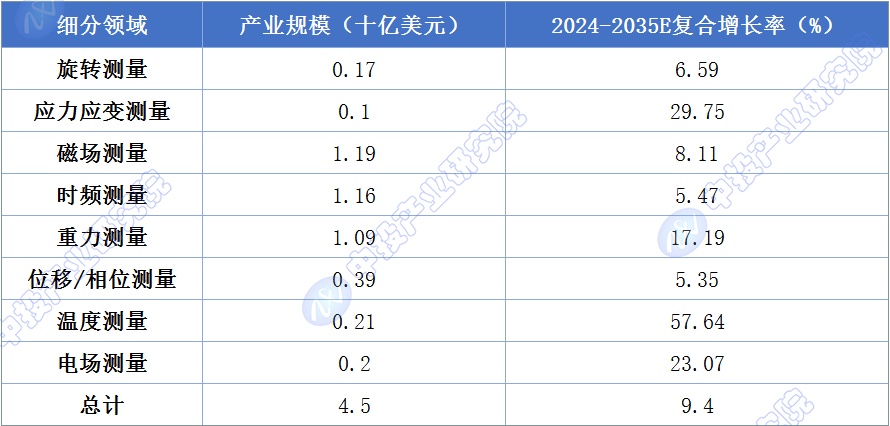 中投产业研究院发布的《2026-2030年中国量子测量行业深度调研及投资前景预测报告》指出,从整体来看,总产业规模从2024年的16.74亿美元增长至2035年的44.97亿美元,年均复合增长率为9.40%,呈现出产业规模持续增长的态势。所有量子精密测量仪器的市场份额都在随着时间的推移而增加,彰显了量子精密测量技术在多个领域的广泛应用潜力及市场需求的逐渐扩大。