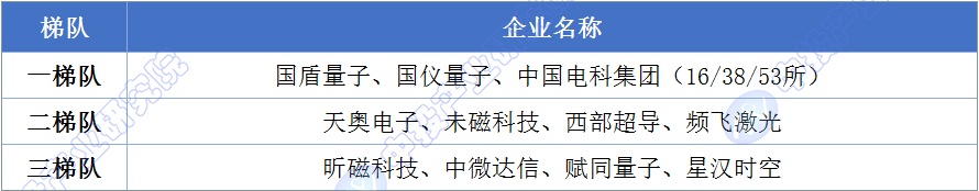 在中国量子精密测量行业中,企业依据技术实力被划分为三个梯队。第一梯队包括国盾量子、国仪量子及中国电科集团,这些企业拥有全面的量子精密测量产品线,产品涵盖量子传感器、量子雷达、量子计时、光学频率梳等,其产品已实现国内外市场的规模化销售,掌握多项核心专利,并在标准制定中拥有一定话语权,同时获得国家专项基金支持以及军工和航天项目的长期合作机会。第二梯队企业主要有天奥电子和西部超导。天奥电子在量子时间基准领域有不错的技术积累和一定的市场份额,是国内时间频率领域的重要企业,其产品在航天、通信等领域应用广泛。第三梯队企业虽然市场规模相对较小,但在产业链上游拥有重要的技术壁垒,代表企业有昕磁科技、赋同量子等。
