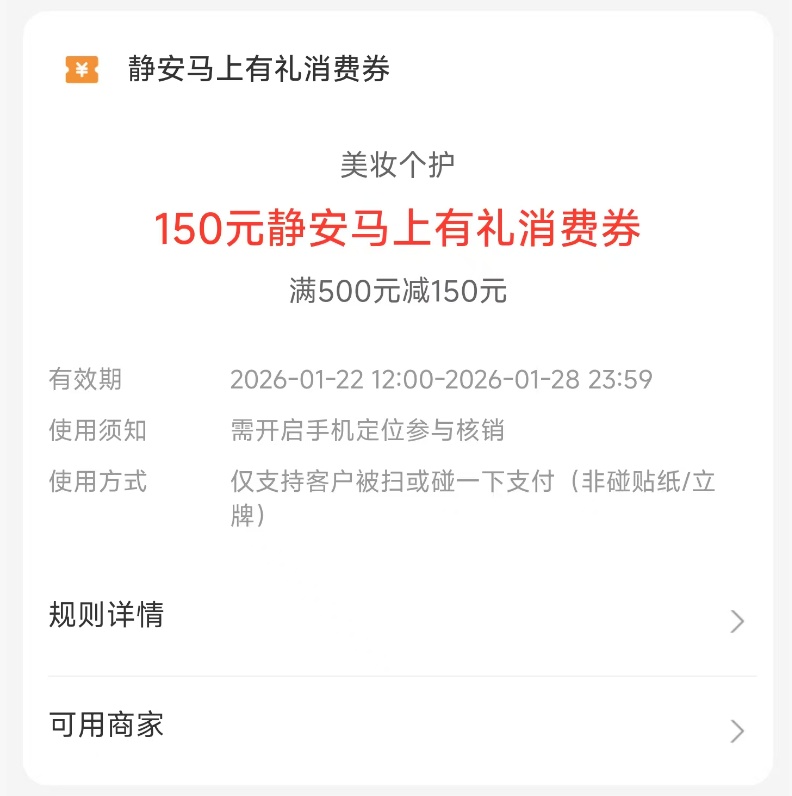 已成功抢到首轮消费券的市民请注意,券面有效期为7天,截止至1月28日23:59,需在有效期内前往静安区参与活动的商户使用。消费券可与商家自有优惠叠加,单笔消费限用1张,不找零、不拆分,建议提前规划购物清单,高效享受实惠。