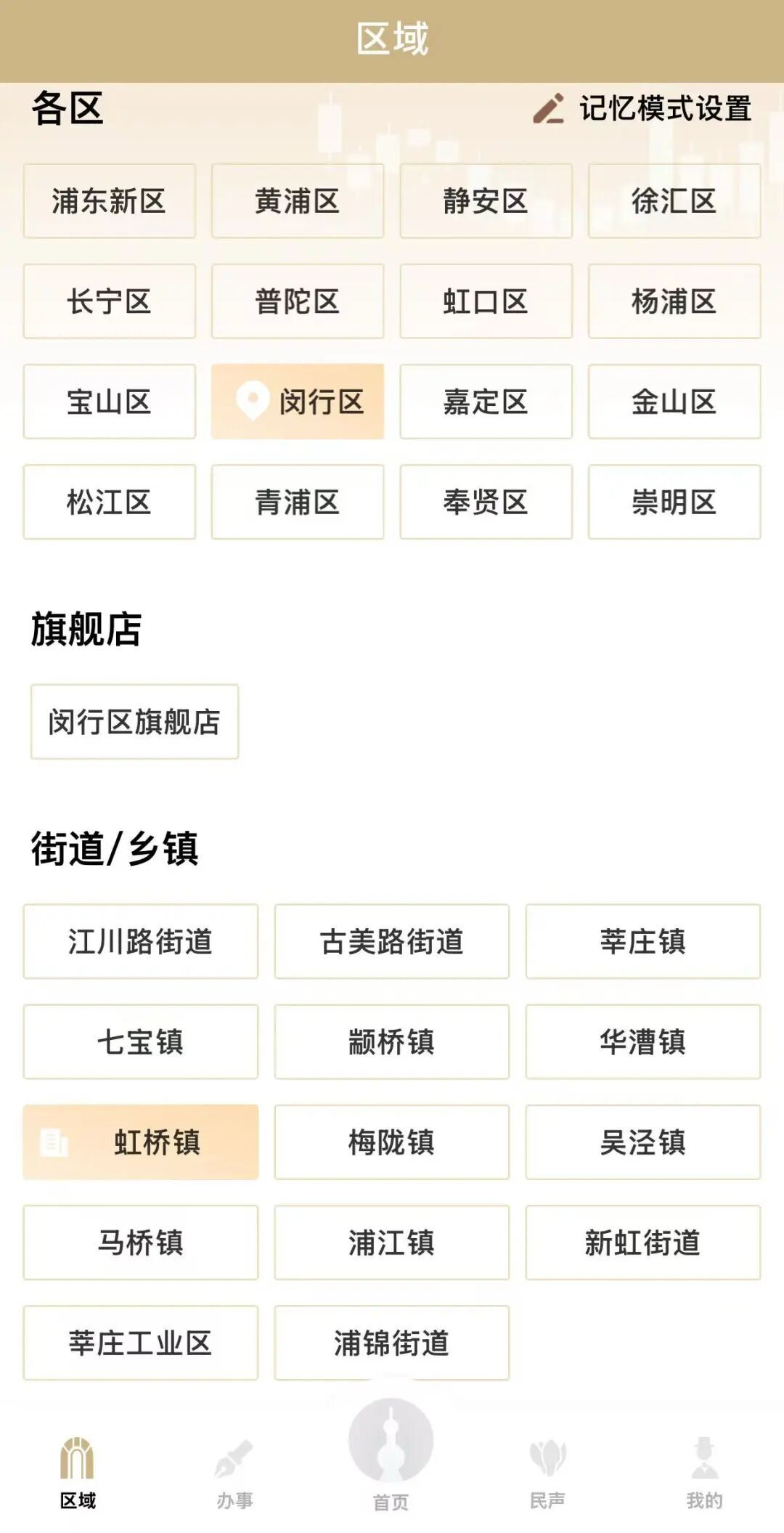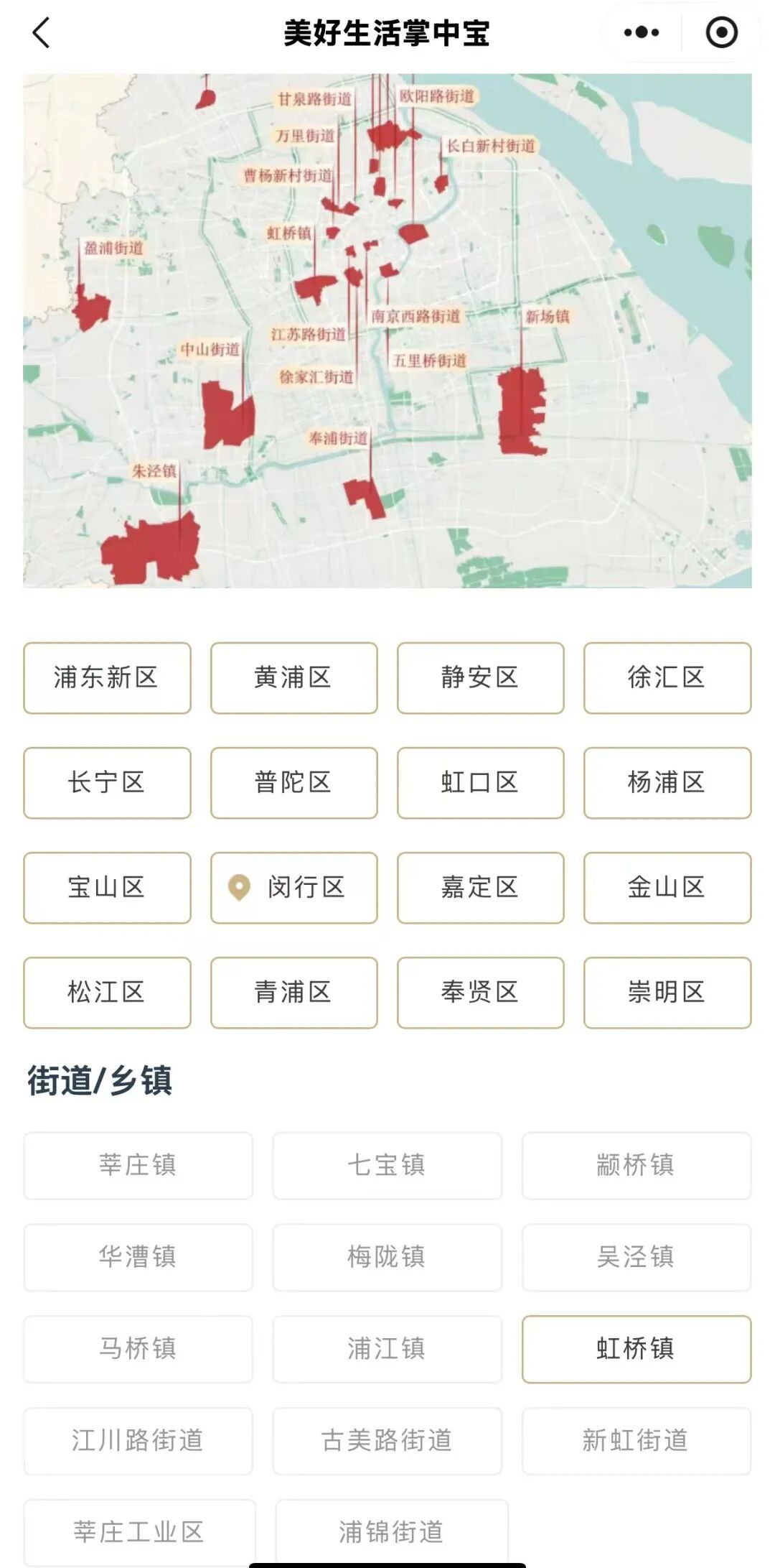 点“区域”、点“闵行区”、点“虹桥镇”,