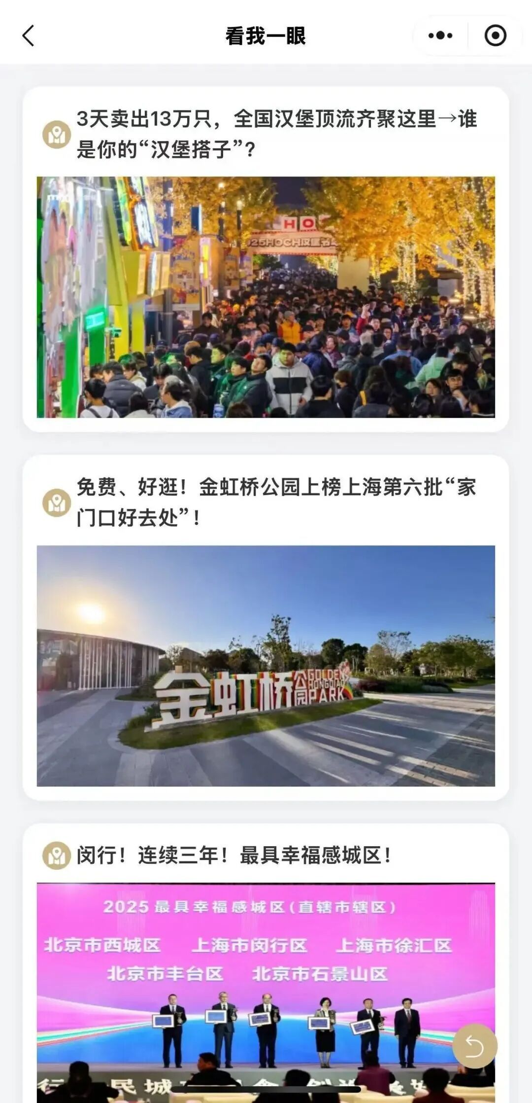 除了提供便民服务,平台还搭建了居民参与社区治理的通道。“听我一言”板块可接收居民的建议反馈和意见征集,让规划更贴近实际需求,推动生活圈从政府配给向居民共建转变;“有我一票”板块支持居民评选15分钟生活圈案例、推选“闵行好物”,参与社区决策;“看我一眼”板块兼具资讯传播与文化展示功能,居民不仅能浏览官方权威信息、观看“人民城市大课堂”,还能了解翰林匾额博物馆、金虹桥公园等文化场馆相关动态。