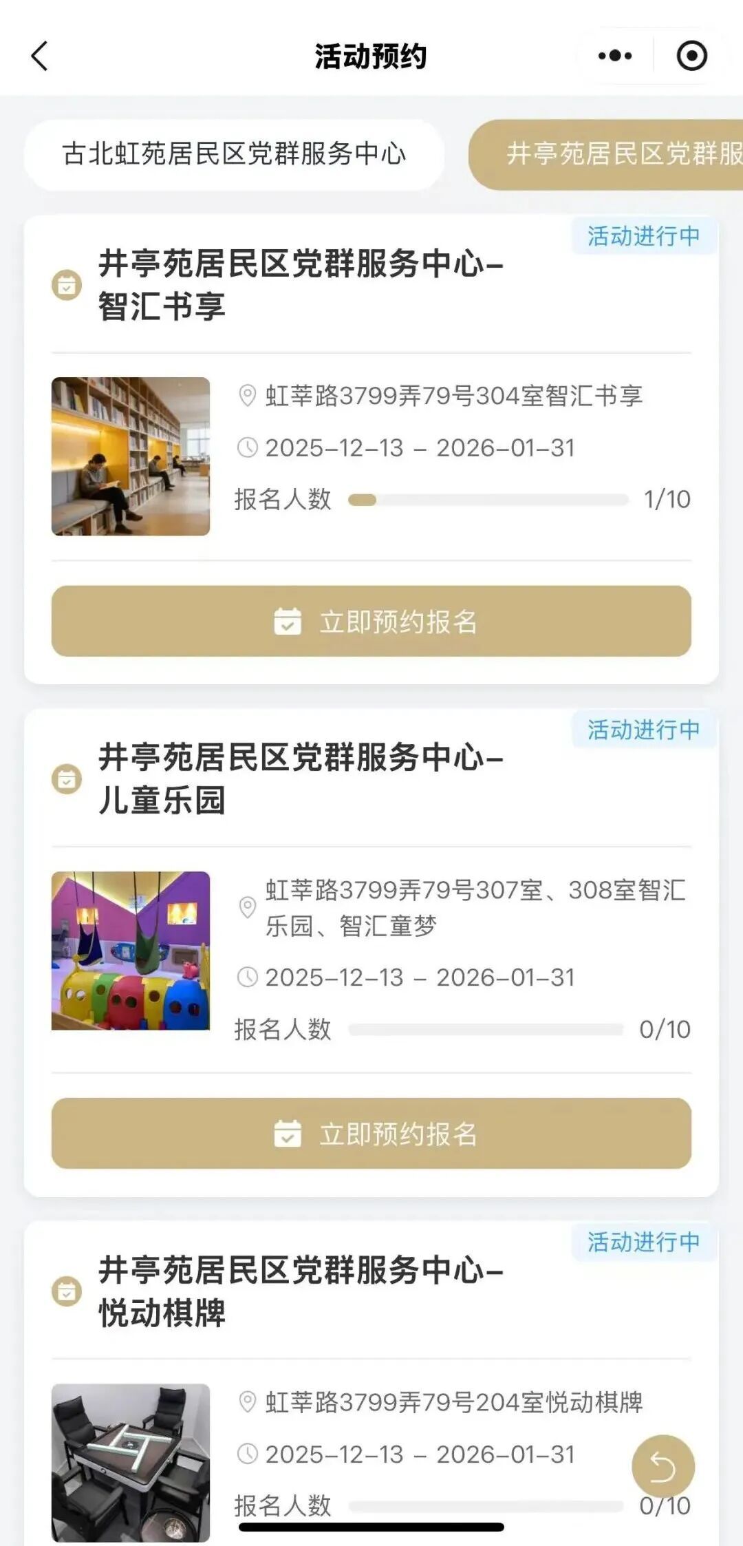 此外,镇域内几家党群服务中心的棋牌、乒乓球、面塑班、健康小屋等活动,除了显示相关信息,有的还开通了线上预约通道,通过该板块一键预约,无需再逐一向居委会咨询。