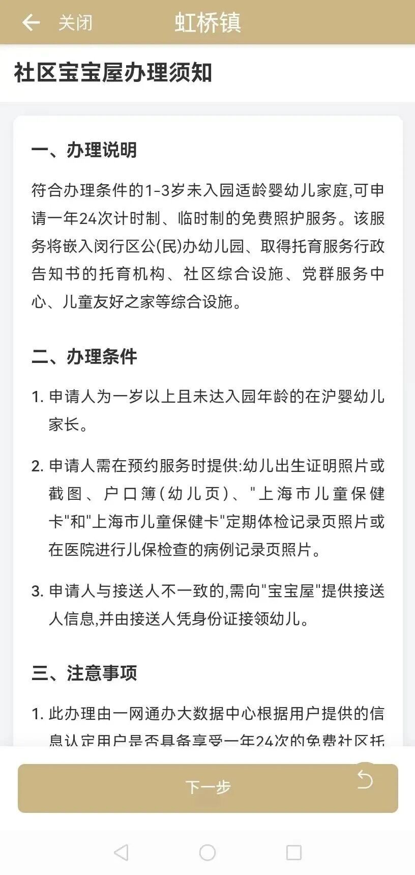 “社区宝宝屋”预约服务同样实用。符合办理条件的1—3岁未入园适龄婴儿家庭可申请一年24次的计时制、临时制免费看护服务。家长填写信息后,“一网通办”大数据会自动审核用户是否具备享用资格。