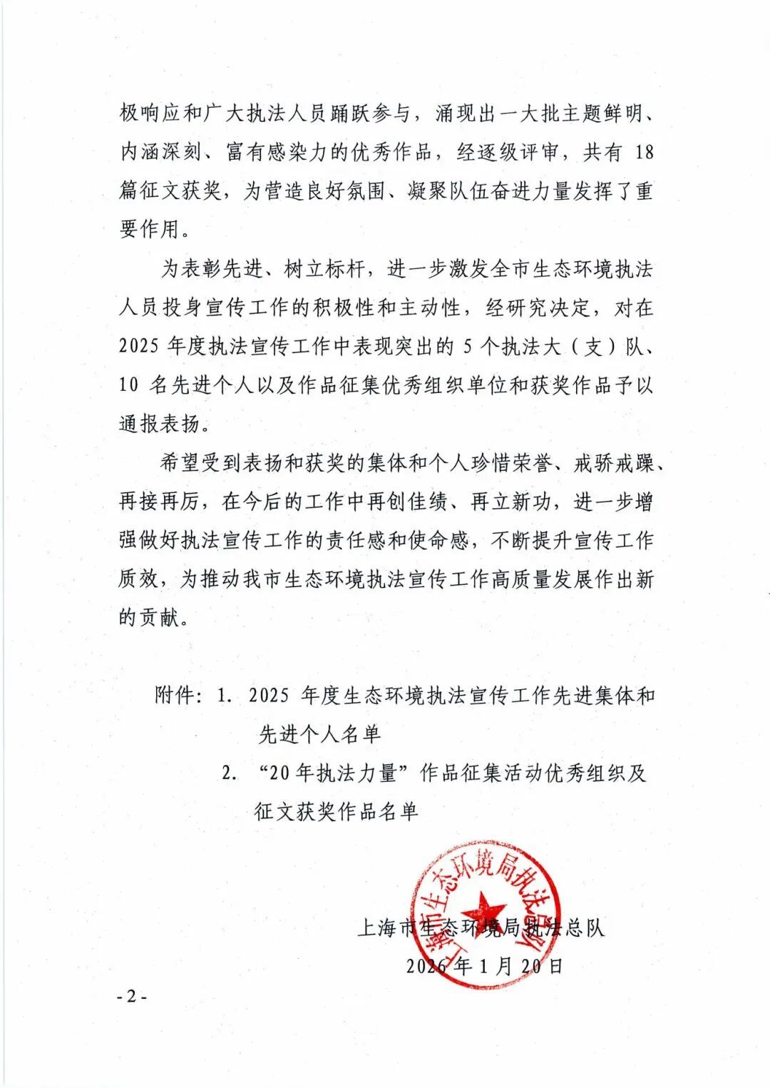 会议通报表彰了2025年度执法宣传工作先进集体、先进个人及“20年执法力量”作品征集活动优秀组织和优秀作品,并对先进集体和优秀组织进行了现场颁奖,鼓励相关集体和个人珍惜荣誉、戒骄戒躁、再接再厉,在今后的工作中再创佳绩、再立新功。