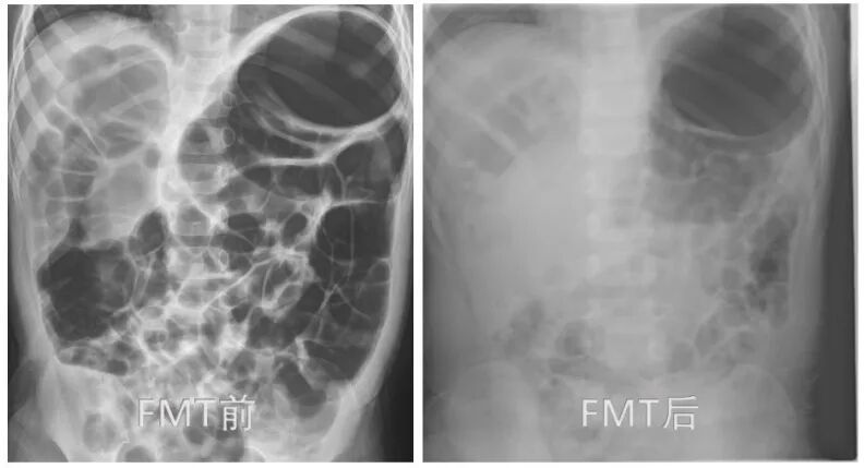 图:患者接受肠道菌群移植术(FMT)治疗前后腹部平片对比