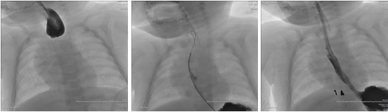 以上图为DSA造影检查(A、近端食管几乎完全闭锁,造影剂无法通过;B、自食管远端逆行置入导丝;C、导丝引导下置入食道球囊,扩开食道)