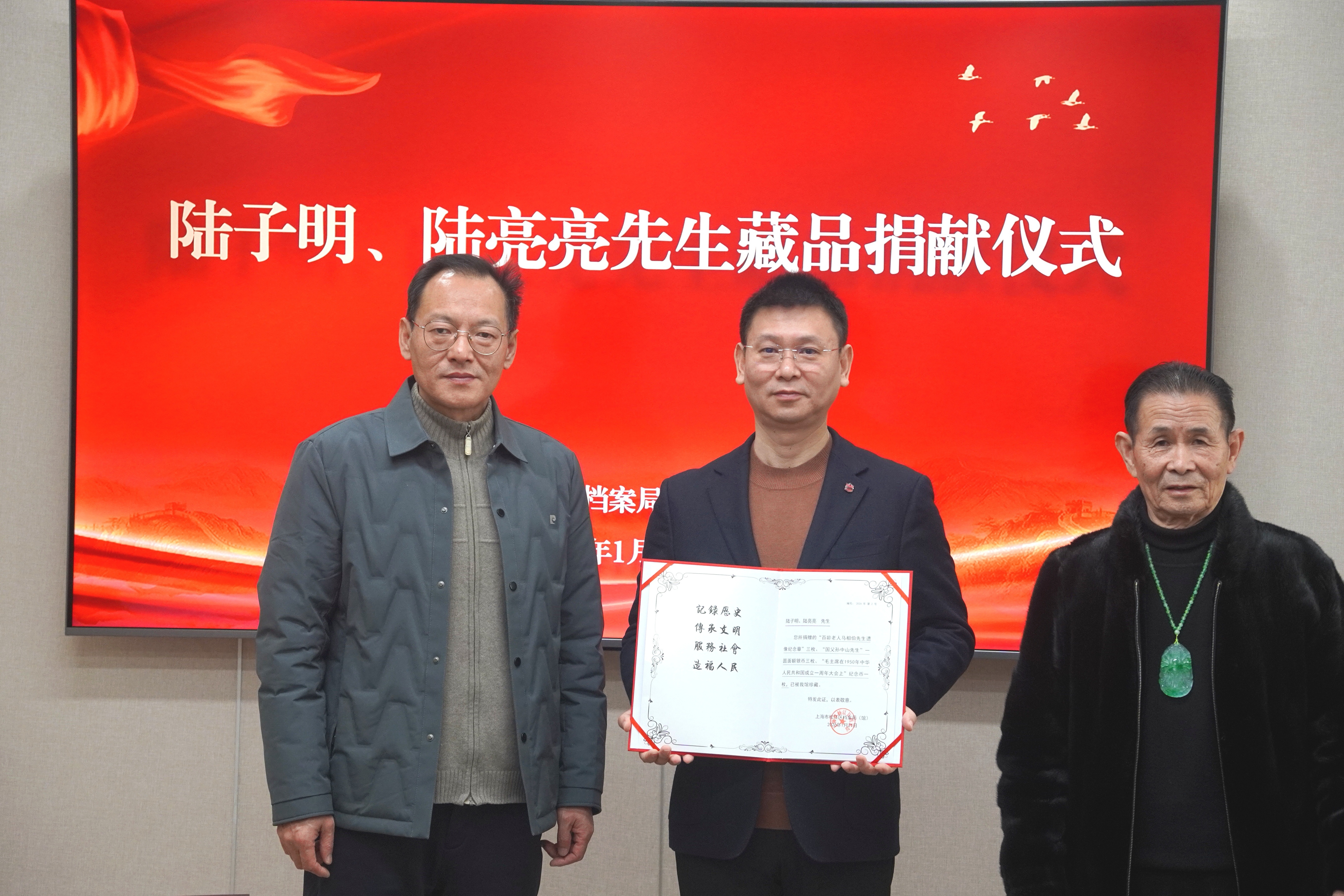 1月22日上午,松江区档案馆迎来一场意义非凡的文物捐赠仪式,旅美华侨陆子明携其子陆亮亮向馆内无偿捐赠7枚珍贵银圆和纪念章。其中,3枚刻有马相伯头像的纪念章尤为珍贵,为松江本土历史文化研究与教育再添重要实物资料。
