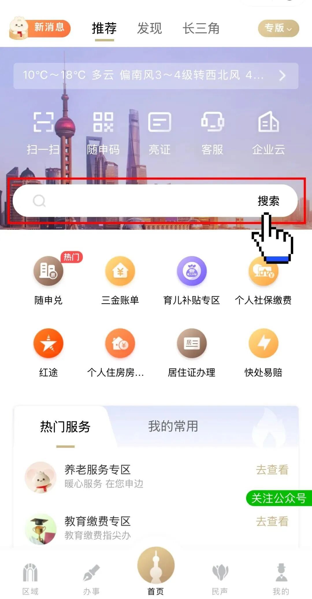 打开“随申办市民云”App,在首页的搜索栏输入“养老服务专区”,或通过首页热门服务中的“养老服务专区”进入,即可轻松办理各类相关业务。