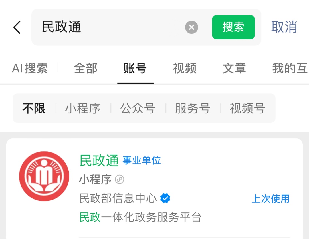 微信/支付宝搜索“民政通”进入小程序。
