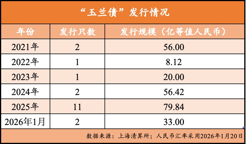上海清算所数据显示,2025年共有11单“玉兰债”完成发行,发行金额约80亿元(按2026年1月20日人民币汇率计算,下同),创下历史新高,同比增速超40%;2026年伊始,已有两单“玉兰债”率先落地,发行规模33亿元。