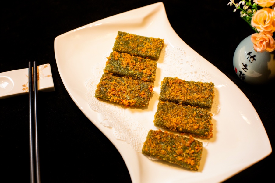 铜锣糕以糯米粉为纸,以野艾青、山茶油、红糖、佛耳草等天然草木为墨,捶打蒸制成深沉墨绿的圆糕,面上点缀着红丝黄糖,宛如一枚盖在古镇时光画卷上的斑斓钤印。
