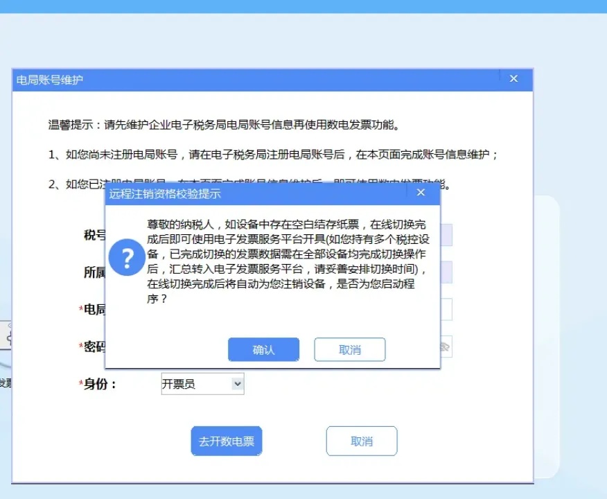 第一步:登录提示插入税控设备,登录增值税发票开票软件。如您具备远程注销资格,系统将自动弹出提示。系统校验点击【确定】,系统将自动校验是否存在空白发票、未上传发票或未完成征期抄报。如点击【取消】,则自动返回开票软件主页面。