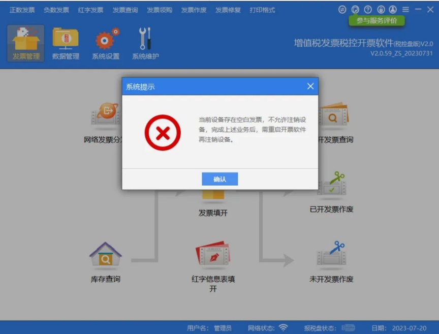 如校验不通过:系统会明确提示原因(如 “税控设备中因存在空白发票”),请您按提示完成对应业务后,重启开票软件即可再次尝试远程注销。