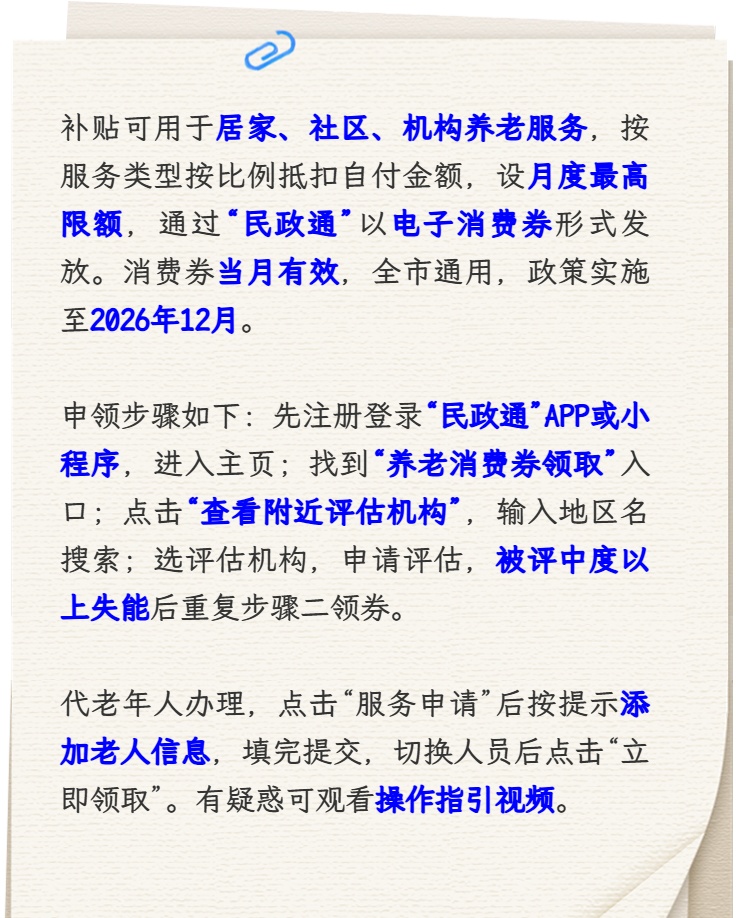 日前,上海市民政局、财政局联合印发《关于开展向中度以上失能老年人发放养老服务消费补贴项目的通知》,根据民政部、财政部的统一部署,在今年1月到12月期间,向本市中度以上失能老年人发放养老服务消费补贴。 点击“划重点”极速浏览↓↓↓ 补贴对象 经老年人能力评估认定为中度、重度或完全失能的老年人。正在享受特困人员供养救助待遇、经济困难失能老年人集中照护服务补助、居家和社区基本养老服务提升行动项目服务的老年人,不纳入本补贴范围。 补贴项目 可用于包括居家、社区、机构养老服务。居家、社区养老服务主要包括助餐、助浴、助洁、助行、助急、助医服务,以及康复护理、日间托养等服务(详见“民政通”公布的“居家社区养老服务补贴项目清单”);机构养老服务包括长期服务(入住机构时间在30天以上)和短期服务(即“喘息服务”,入住机构时间在30天以内)等。 补贴标准 根据服务类型,按比例抵扣老年人自付金额,并设定月度最高限额。 居家上门养老服务按自付金额50%抵扣,每月累计不超过800元;社区养老服务、机构养老服务(含床位费、护理费、伙食费)按自付金额40%抵扣,每月累计不超过800元。 享受补贴者不再区分失能等级,不得折现,仅可通过“民政通”购买养老服务。抵扣比例、额度将按国家部委要求动态调整。 中度以上失能老年人正在享受长期护理保险待遇的,扣除已享受的长护险待遇后,个人自付部分可按规定比例抵扣。 补贴形式 补贴通过“民政通”(App或微信小程序)以电子消费券形式按自然月向中度以上失能老年人发放,不得支取、不得套现。 这个“养老服务消费补贴”是给咱们老人发钱吗? “养老服务消费补贴”是指由政府发放的电子消费券,和其他消费券一样,都不能取现;对象是“中度以上的失能老人”,可以用这个电子消费券抵扣需要支付的部分养老服务费用,不能用于购买实物商品。 “养老服务消费补贴”是通过什么渠道发放的? 这项补贴是通过“民政通”App或小程序按月发放。 我家里也有老人,今年68岁了,身体不太好,我也想知道,到底哪些老年人能申请这项补贴? 所有年满60周岁的中国籍内地居民,经过能力评估,属于“中度失能、重度失能或完全失能”的,都能申请。但是,如果老人正在享受特困供养等特定救助待遇,就不能再被纳入这次补贴的范围了。 我家老人户籍在江苏,但一直居住在上海,像这种情况能申请吗? 可以的。“养老服务消费补贴”是以“居住地”作为发放条件的。就以你的例子来说,老人户籍在江苏,但一直居住在上海,他就能在上海这个长期居住地申请,享受上海的养老服务消费补贴。 刚才一直强调,达到“中度以上失能”是申领“养老服务消费补贴”的条件,这个有具体标准吗?比如,我家老人平时走路得拄拐杖,吃饭需要人帮忙盛,洗澡也得有人看着,算不算中度失能? 老人的身体状况是否属于失能,失能到了什么程度,都需要由专门的机构按照国家标准(《老年人能力评估规范》)进行评估。评估结果分为五个等级:“能力完好、轻度失能、中度失能、重度失能、完全失能”。如果您家老人没有接受过评估,建议老人或者你们家人通过“民政通”小程序自评,自评达到中度及以上失能等级的,再申请由专业评估机构评估。 这里我要提醒一下,2024年7月1日至2025年12月31日期间,在上海做过“老年照护统一需求评估”且达到“3级”及以上的,不必再做评估了,系统会自动为他转换成“中度及以上失能”的等级,并上传到“民政通”系统。 我打算带我家老人去做一次评估,评估需要我们自己出钱吗? 老年人能力评估是要收费的。但是,被评估为“中度、重度或完全失能”且符合补贴申请条件的老人,评估费用可以减免——如评估费低于100元,免费;如超过100元,超出部分由自己承担;如评估结果是“轻度失能或能力完好”,则所有费用均自理。 如果评估下来符合条件,怎么申请“养老服务消费补贴”呢?我家老人不会用智能手机,家人可以代办吗? 您需要用手机下载“民政通”App或微信小程序,在“养老服务消费补贴”板块进行线上申请。老人的子女亲属、养老机构工作人员或社区工作人员都可以全程帮忙代办。 “养老服务消费补贴”能用于哪些服务呢?如果我家老人不想去养老院,只想请人上门服务可以使用吗? “养老服务消费补贴”可以使用在以下四大类服务上:一是在养老机构接受长期住养服务的费用,这个“长期住养”的标准是30天及以上;二是入住养老机构接受“短期喘息服务”的费用,也就是指入住养老机构不足30天的短期服务费用;三是老人接受“居家上门养老服务”的费用,包括助餐、助浴、助洁、助行、助医、康复护理等服务;四是老人在社区接受“日间托养生活照料服务”的费用。这里,“居家上门养老服务”的费用和“日间托养服务”的费用,要以“居家社区养老服务补贴项目清单”为准。 特别提醒下大家,“中度以上失能”老人,每个自然月可以从以上四大类服务中选择一项,接受服务,当月不可更换。但次月,就可切换选择其他类型服务。换而言之,每个自然月都只能“四选一”。 这个“养老服务消费补贴”每个月能补多少?要是老人已经在享受长护险服务,可以一起使用吗? “养老服务消费补贴”每个月能补多少,要看老人选择了什么服务类型。不同的服务,补