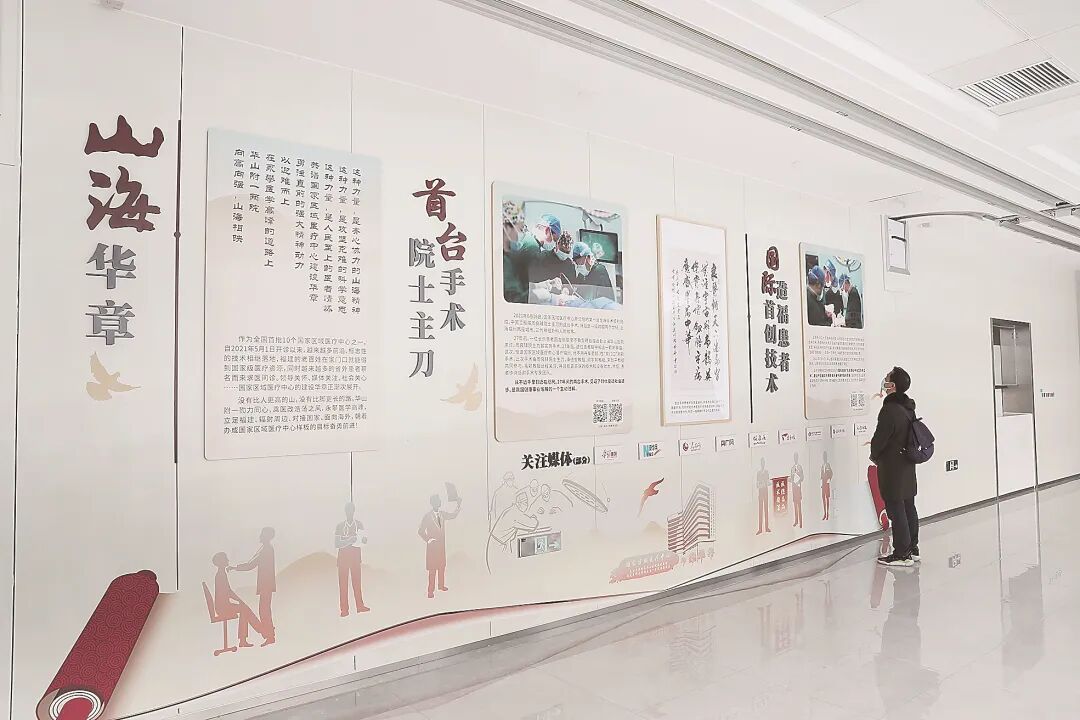 在华山附一医院,患者在山海文化墙前驻足了解华山医院、附一医院合作发展的历程
