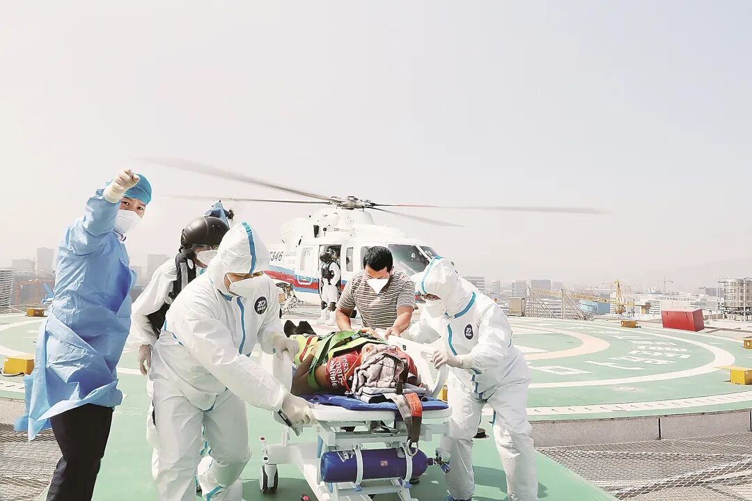 华山附一医院医护人员正通过直升机转运患者(受访者供图)