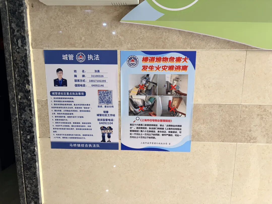 “为落实全区楼道堆物整治工作部署,我们马桥镇综合行政执法队结合夜查开展了34次专项整治。我们印制了2000份海报,张贴至各楼栋,并利用电子屏、社区群等线上线下渠道,广泛宣传楼道堆物的安全风险和法律责任,推动‘楼道畅通=生命通道’的理念深入人心。”马桥镇综合行政执法队银春片区组组长陈昊介绍。