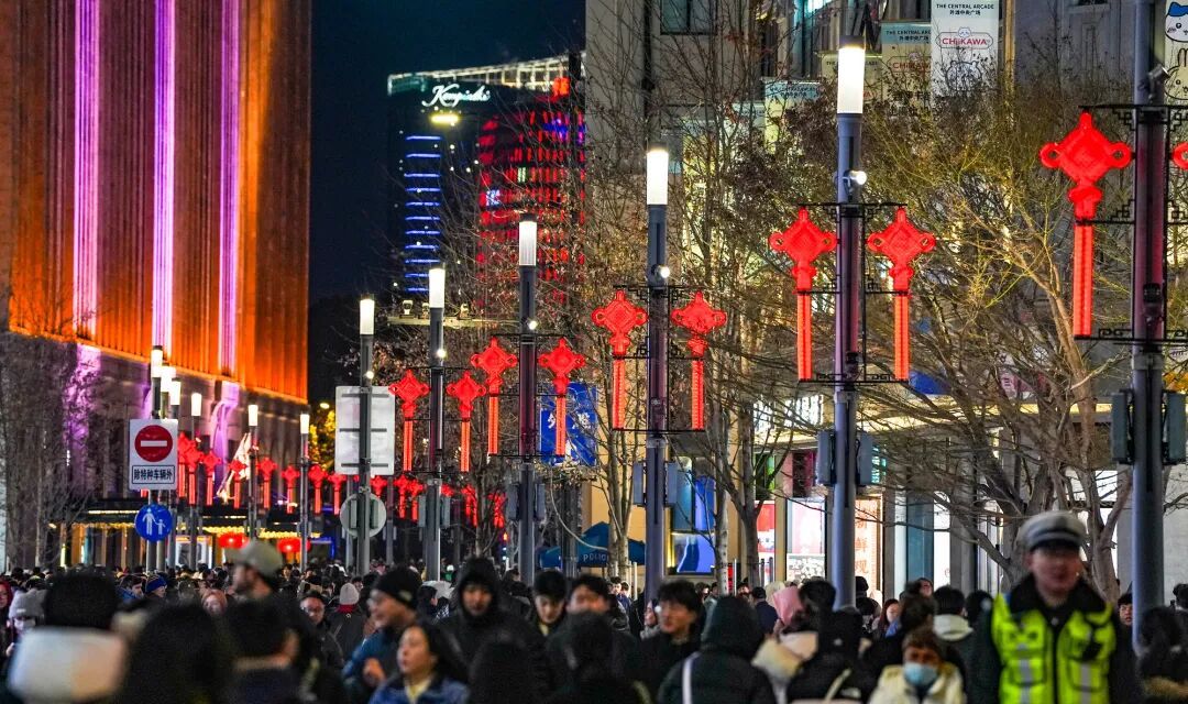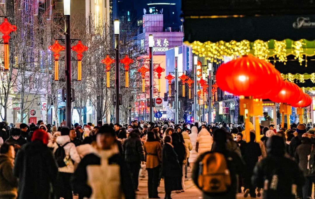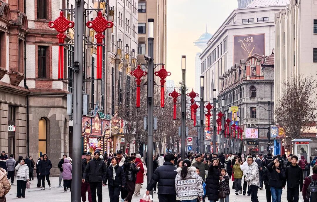 1月21日18时,南京东路步行街东拓段悄然焕新——一排喜庆的“中国结”灯饰在暮色中同时亮起,整齐悬挂于道路中央的灯杆之上。