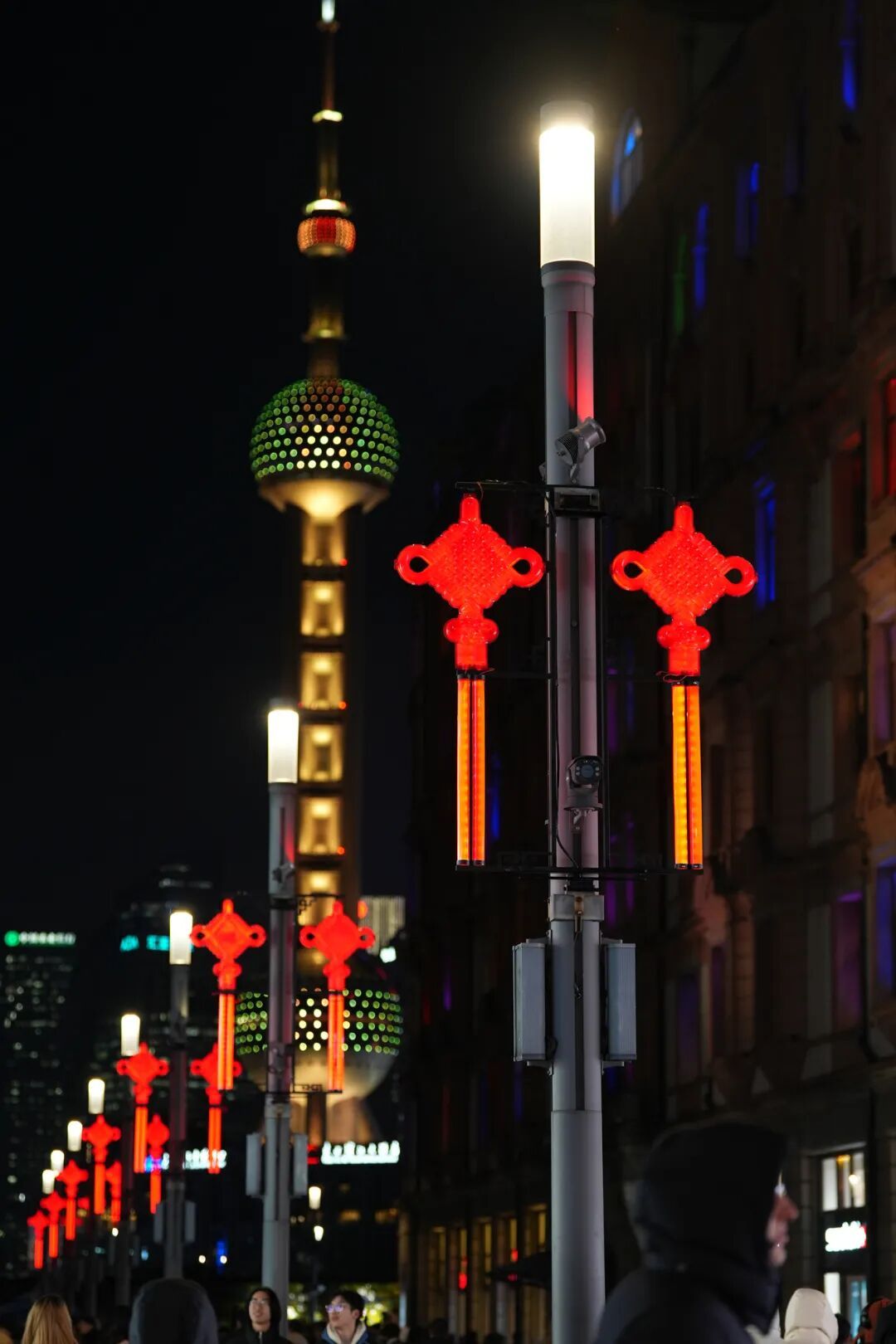 温暖的红光与金边交映,为百年南京路与外滩沿岸披上了新春“彩衣”。