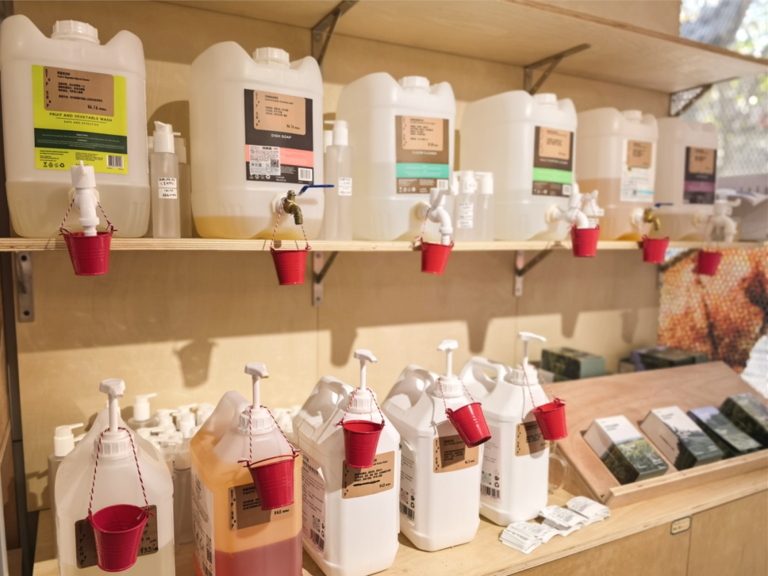 店内氛围温暖,可移动货架让空间布局更为灵活,旧货市场淘来的家具经过改造,既美观又环保。“小店蛮有意思,还有老上海人喜欢的零拷,上次带瓶子过来‘打’了一点清洁剂,挺好用。”王爷爷提到的“零拷”是停停商店的一大特色,果干、坚果、果蔬清洁剂等均支持拆零销售,这也是“让可持续走进更加平凡的日常”品牌理念的生动实践。